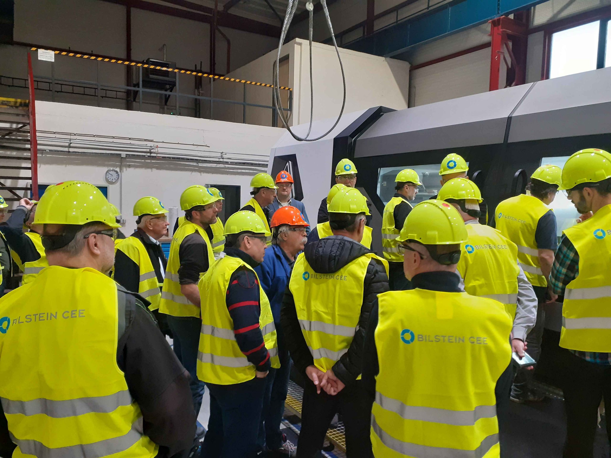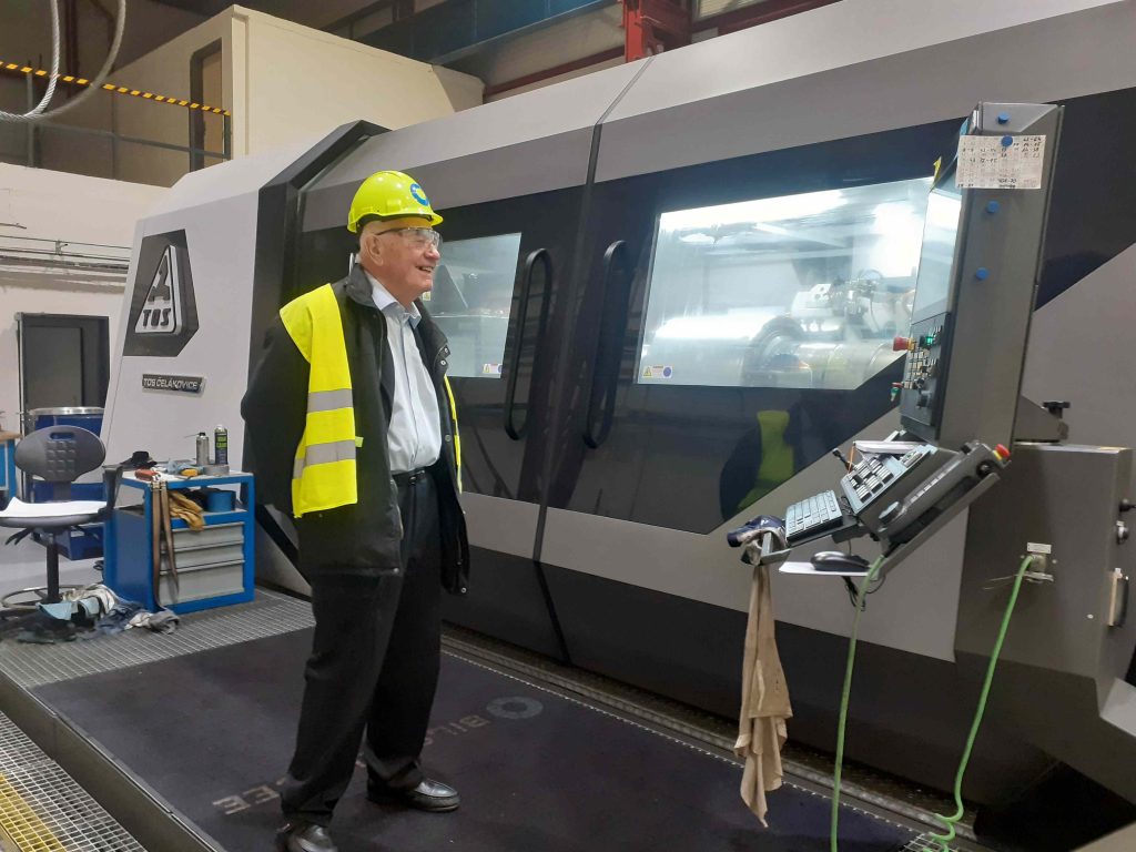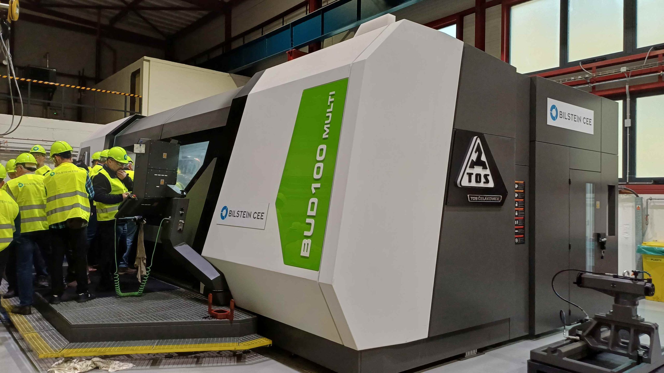 Po úvodním bezpečnostním školení a vyzvednutí ochranných pomůcek, jsme naši exkurzi začali v rekonstruované hale s novou bruskou BUD 100 CNC MULTI na broušení pracovních a opěrných válců. Je to současná vlajková loď od TOS Čelákovice.